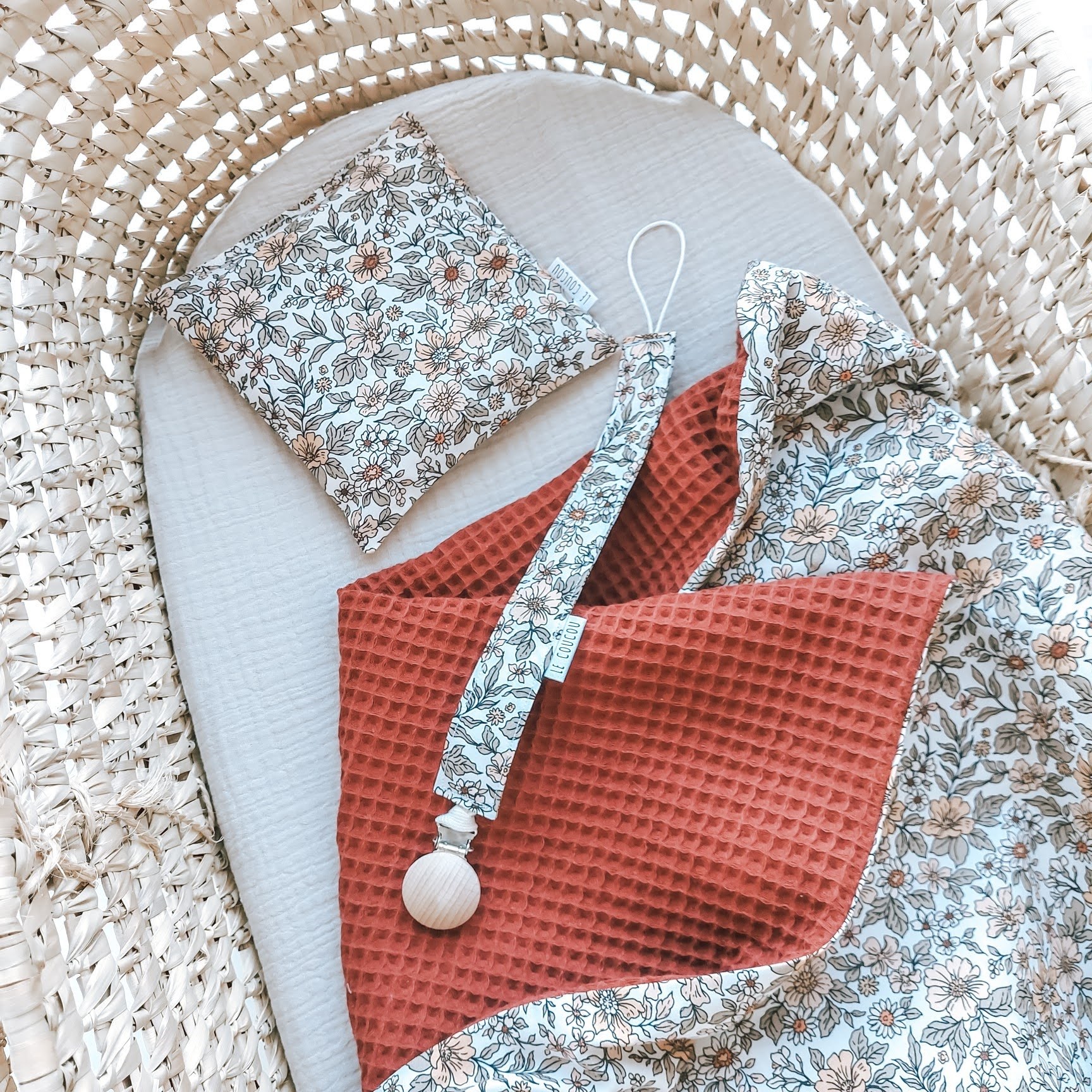 - dwustronnego bawełnianego kocyka wafelkowego (retro kwiaty na bieli/bordo) w rozmiarze 70x100cm