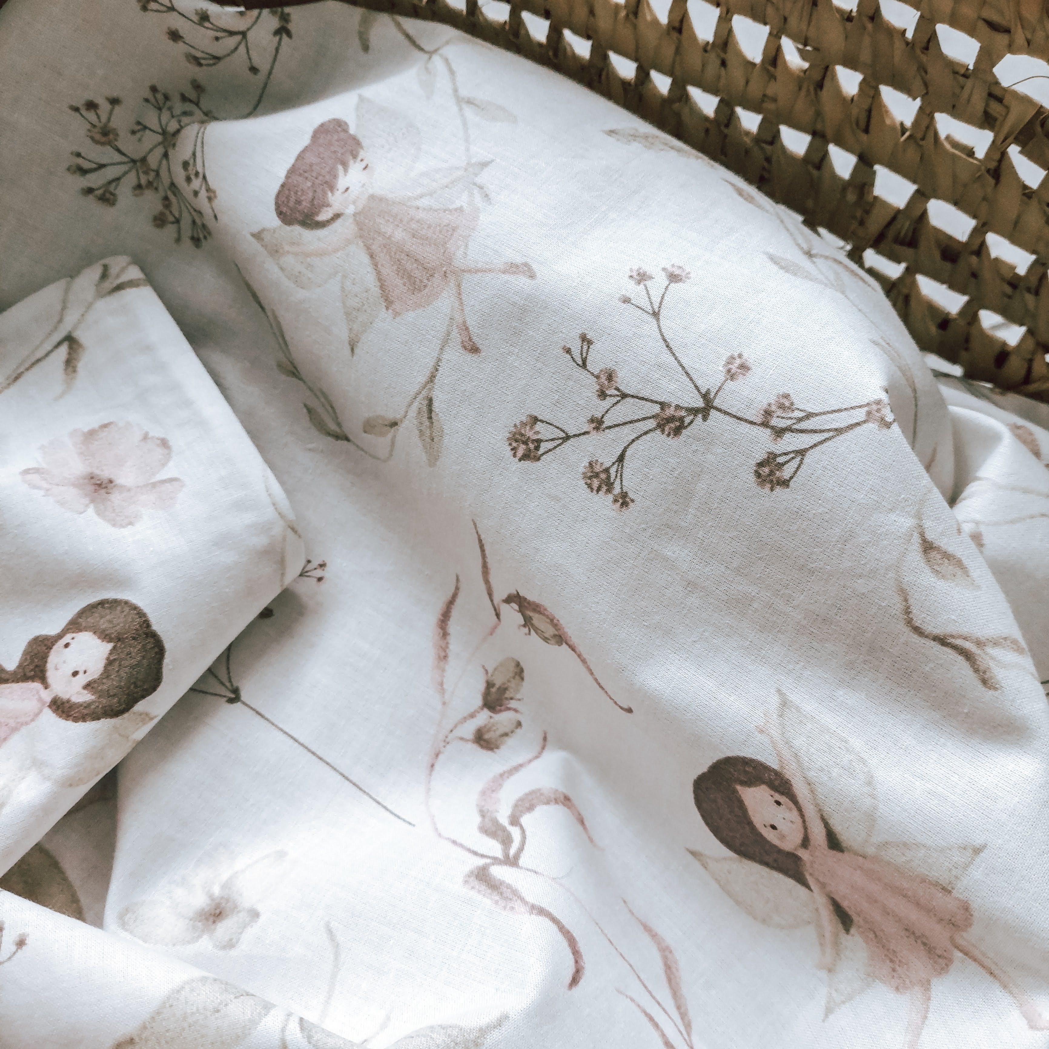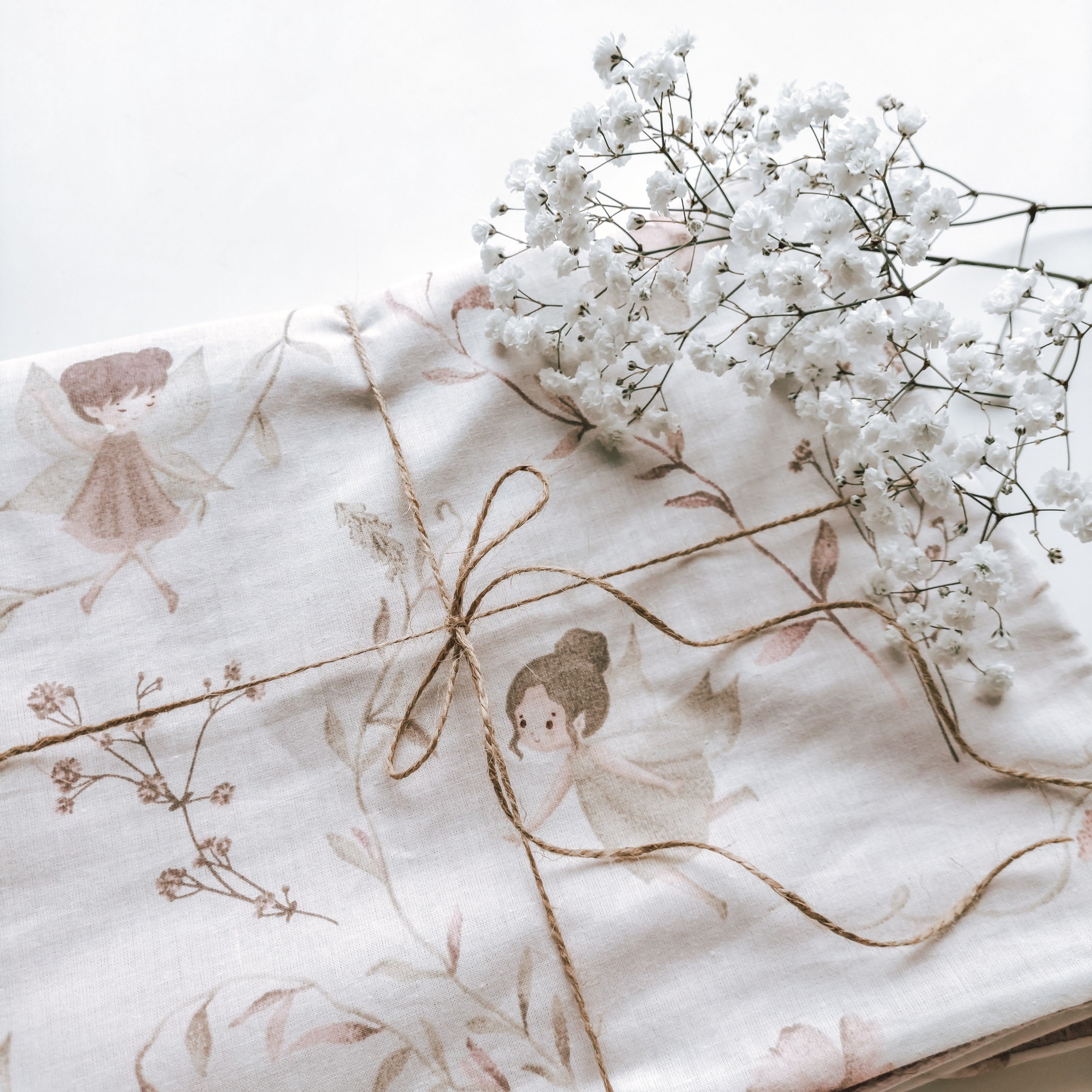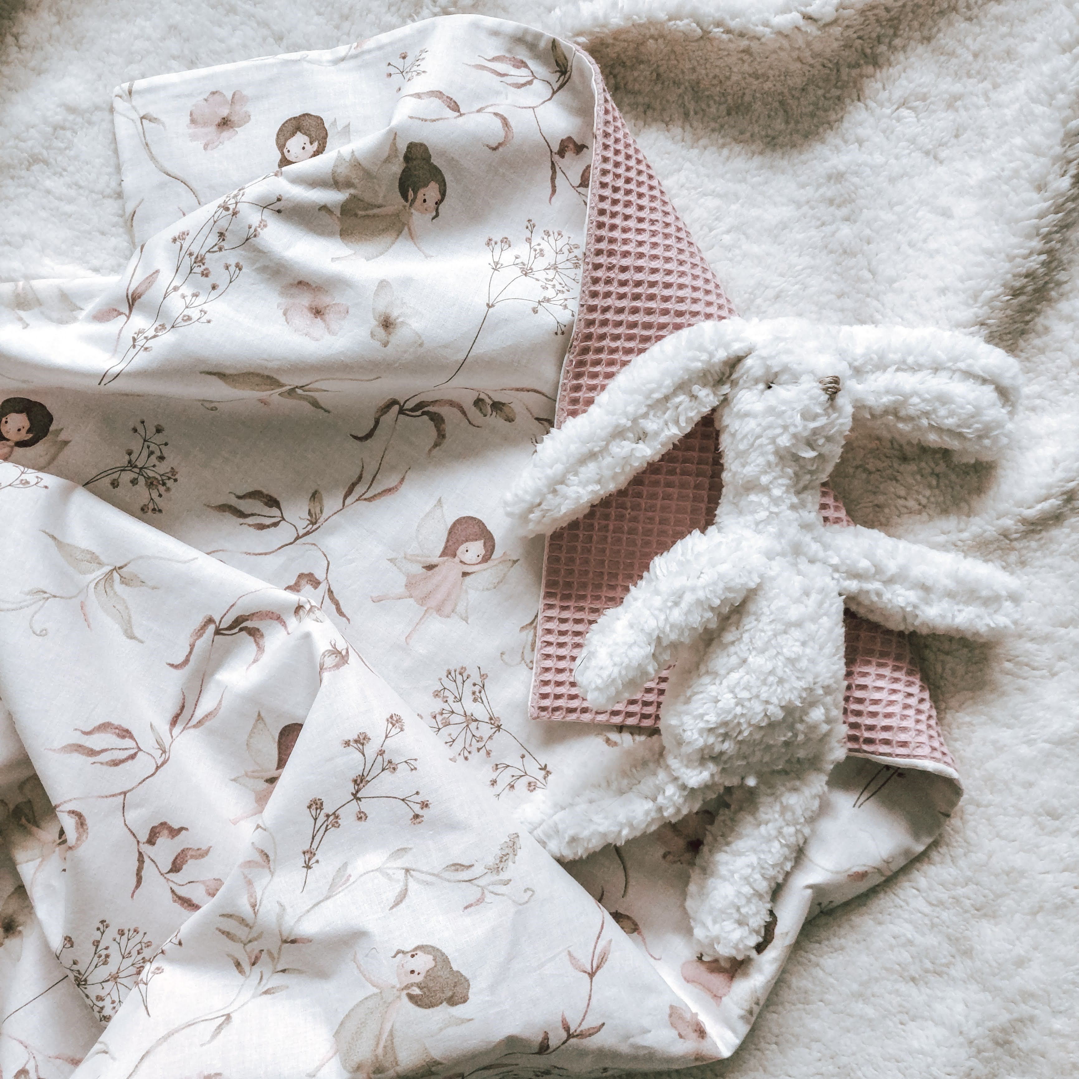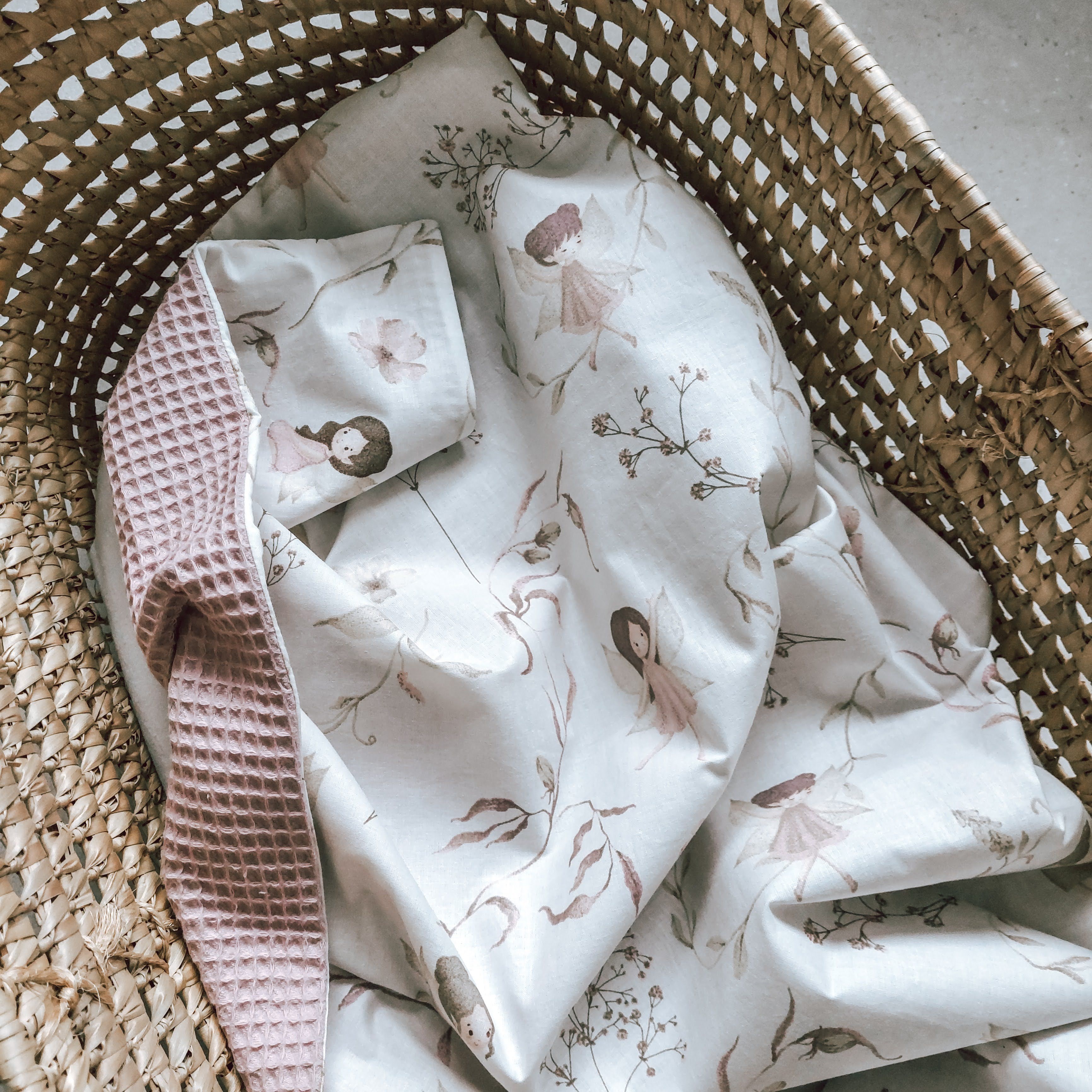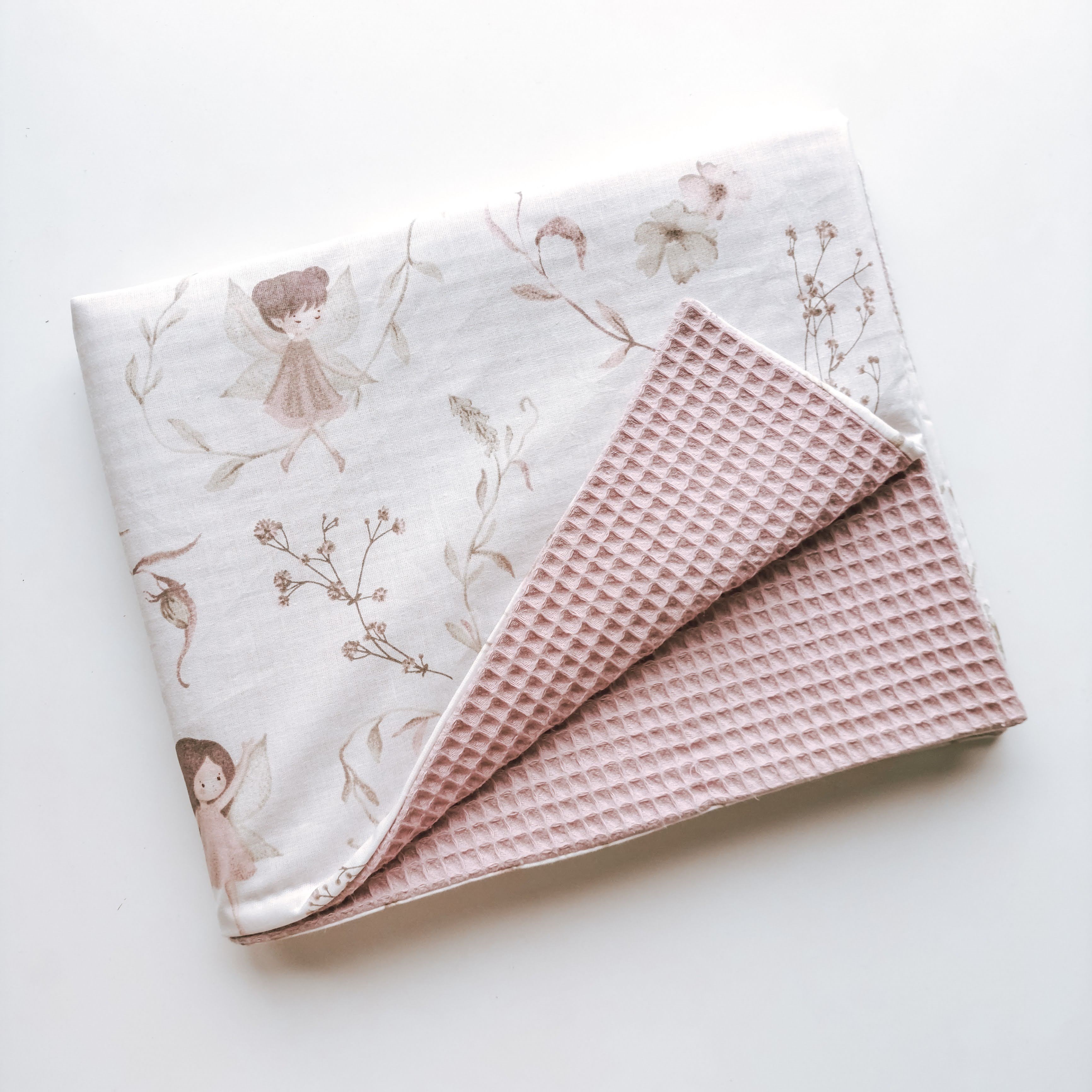 Dwustronny kocyk wykonany z wysokiej jakości tkaniny bawełnianej w pastelowe wróżki oraz wafelka w kolorze różu.