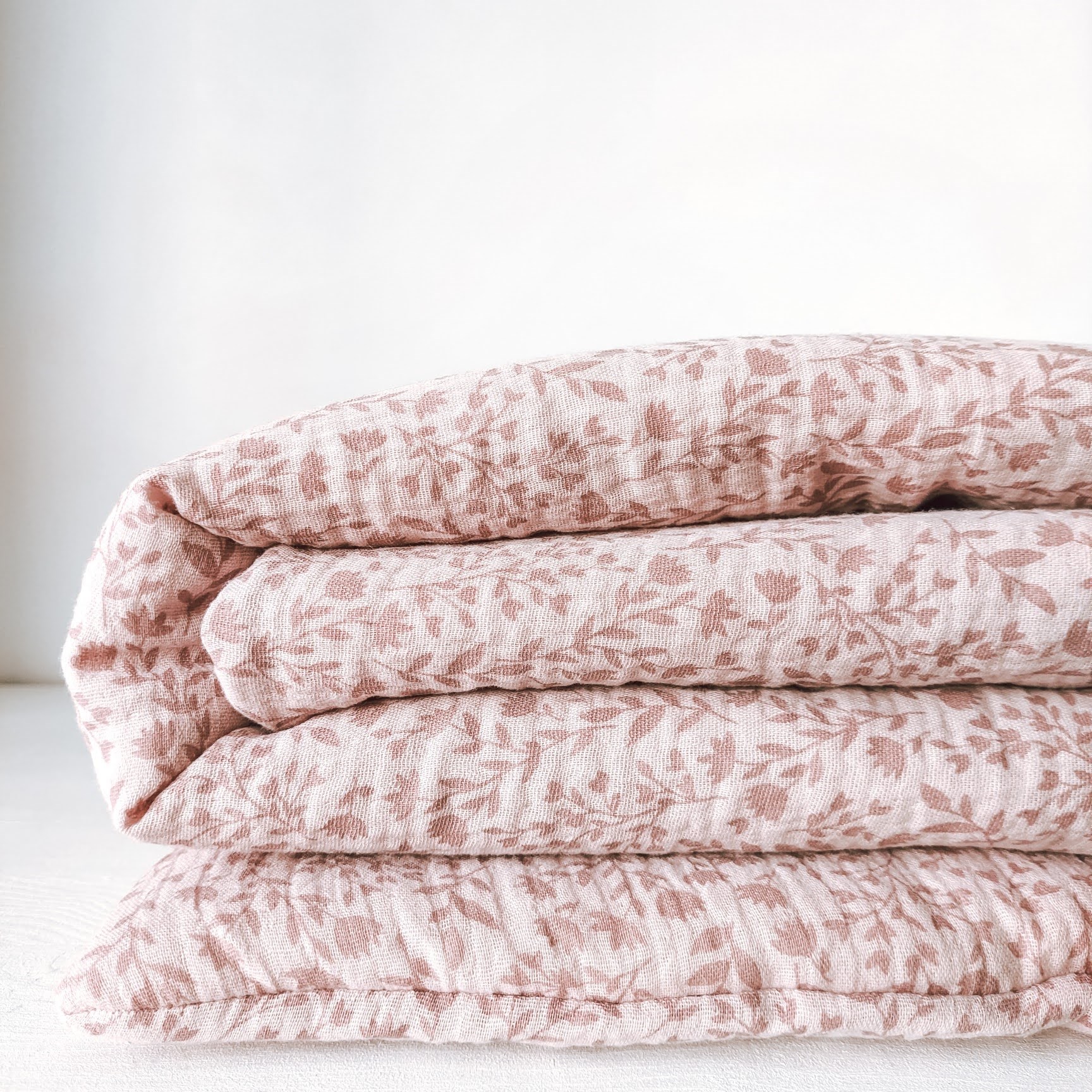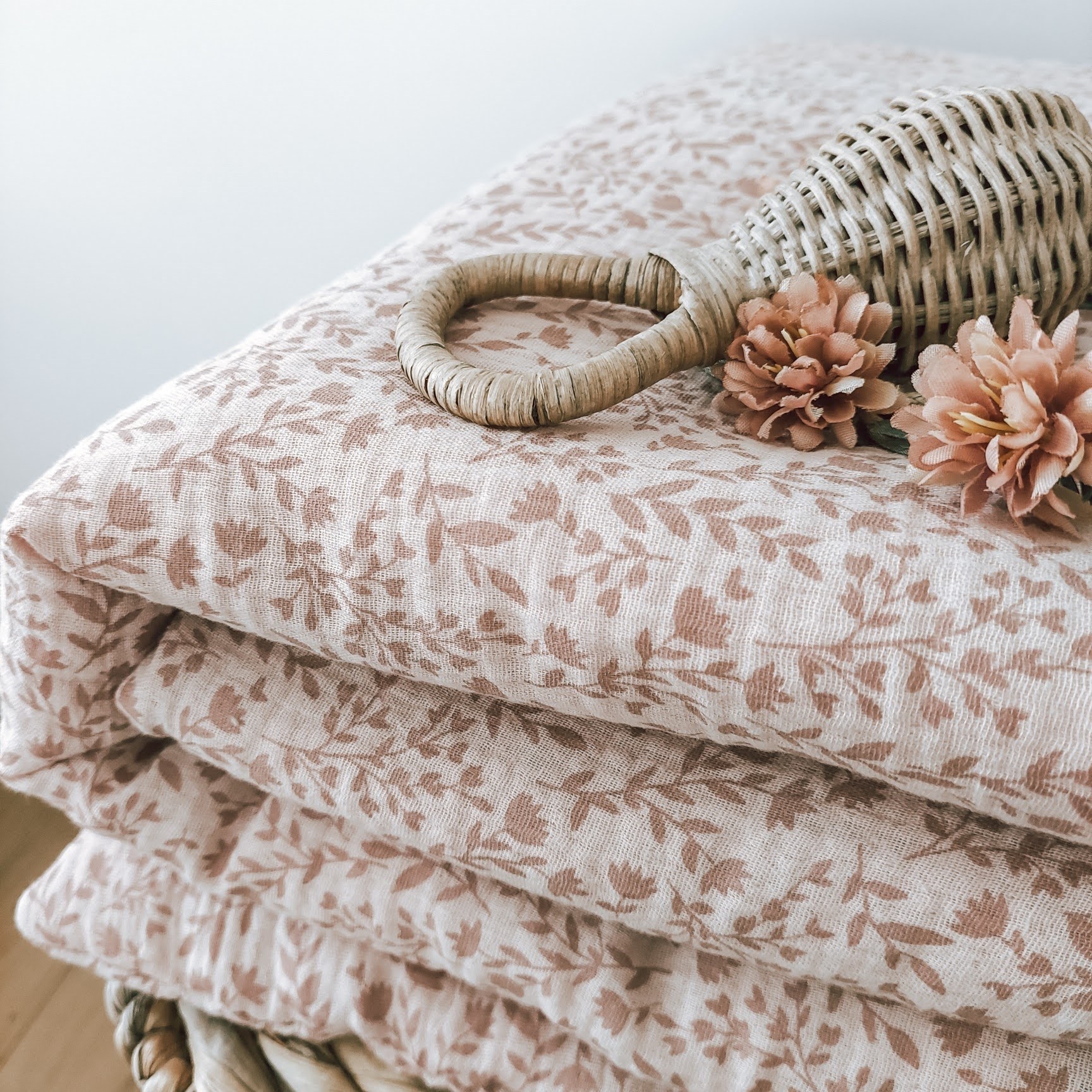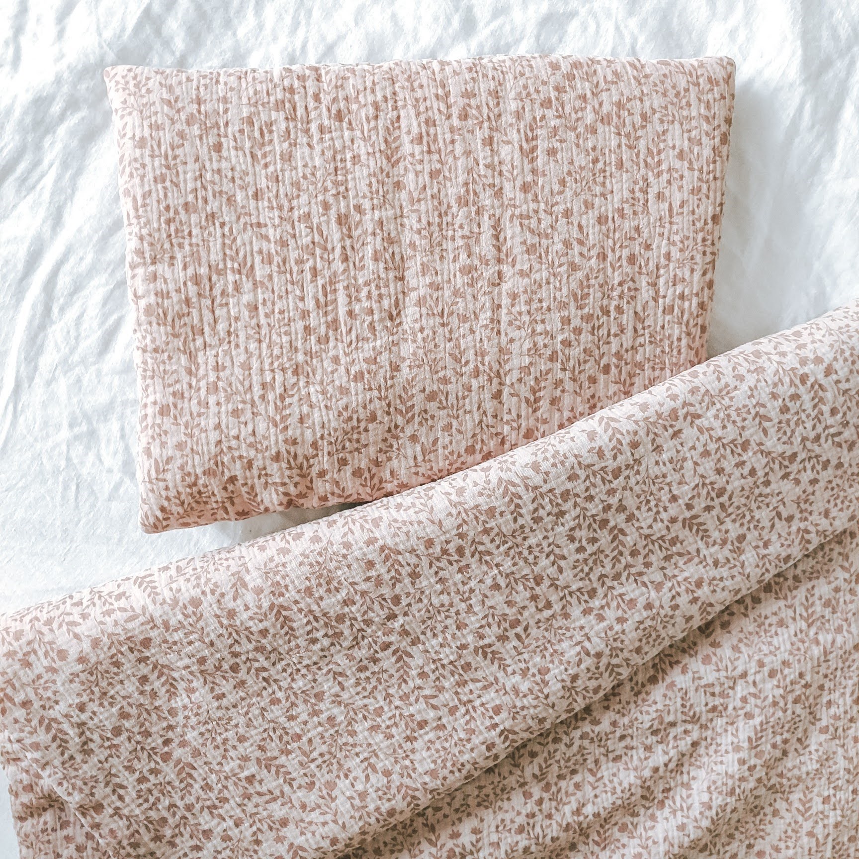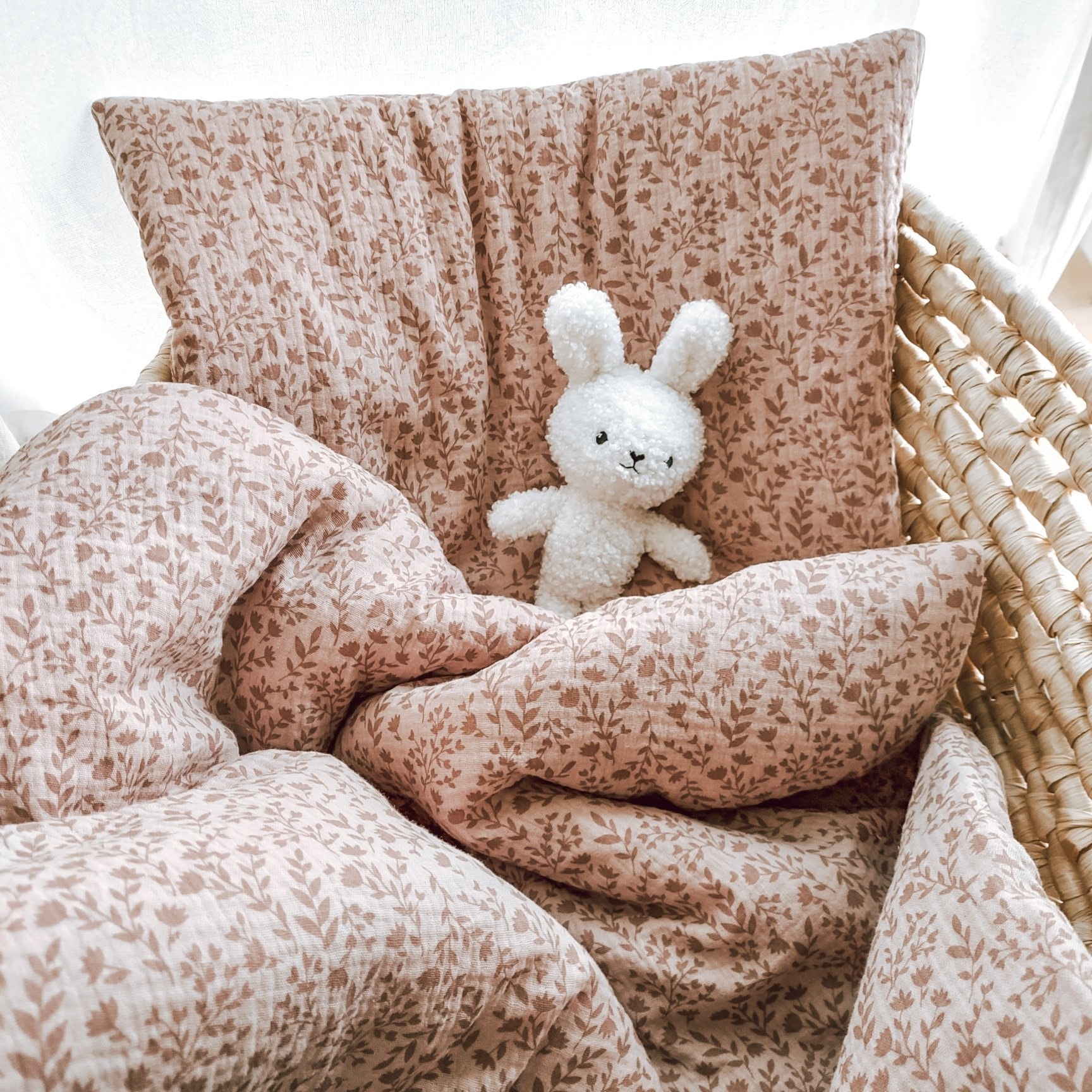 Pościel do łóżeczka i kołyski wykonana z bawełny muślinowej w kolorze wrzosowego różu w różowe gałązki i kwiatuszki, mięciutka i przyjemna dla skóry malucha. Wypełnienie płaskiej podusi i kołderki wszyte jest na stałe, zestaw pościeli można prać w pralce bez obawy o przesunięcie włókniny.