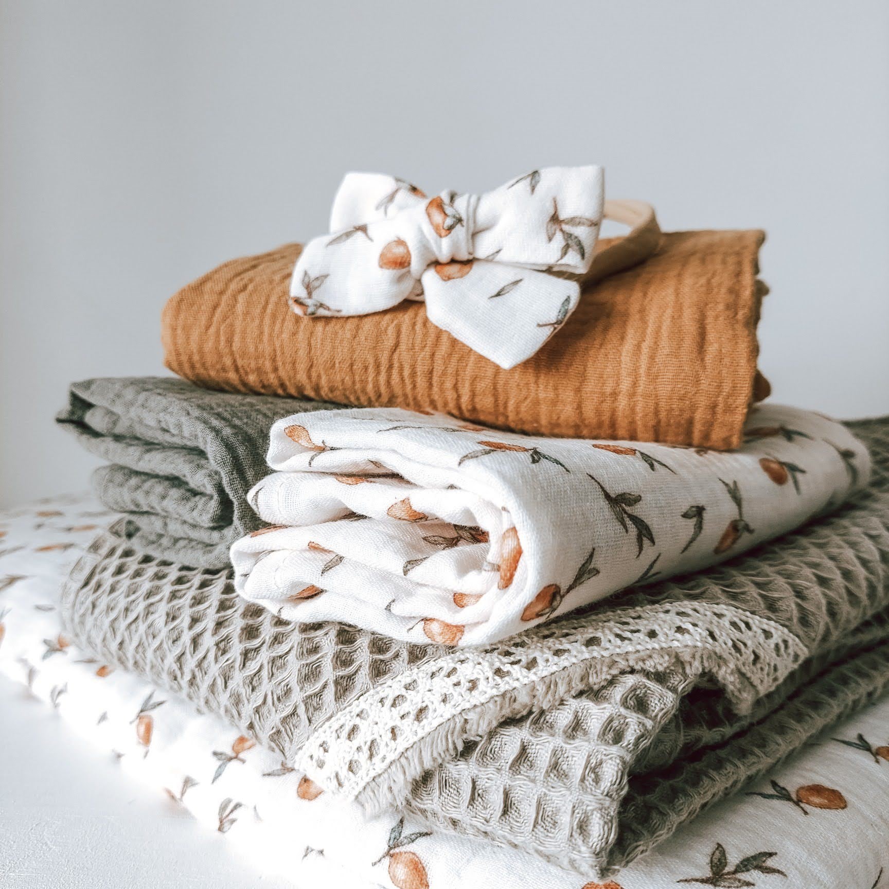 Zapytaj o produktDelikatna, bardzo elastyczna i bezuciskowa opaska z kokardką z muślinu w kolorze kremowej bieli w cytrynki. Rozmiar uniwersalny - odpowiedni zarówno dla noworodka, jak i dla kilkuletniej dziewczynki.