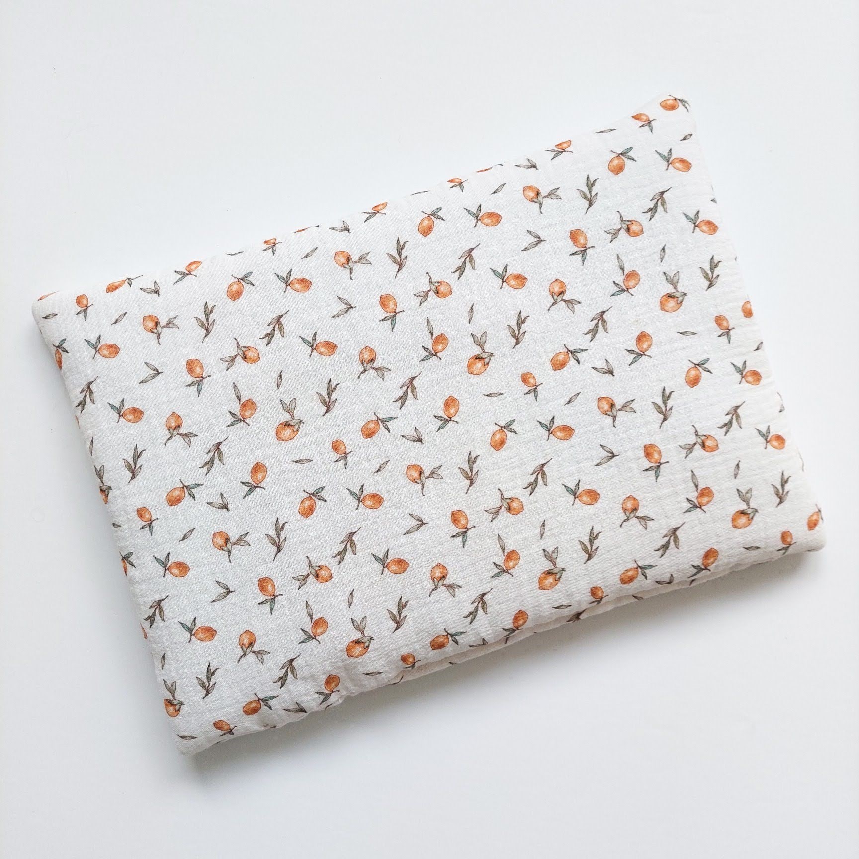 Muślinowy zestaw otulacza i podusi. Otulacz z bawełny muślinowej w kolorze zgaszonej zieleni, wykończony czterema mini chwostami w kolorze starego złota. Mała poduszka z bawełny muślinowej w kolorze ecru w cytrynki.