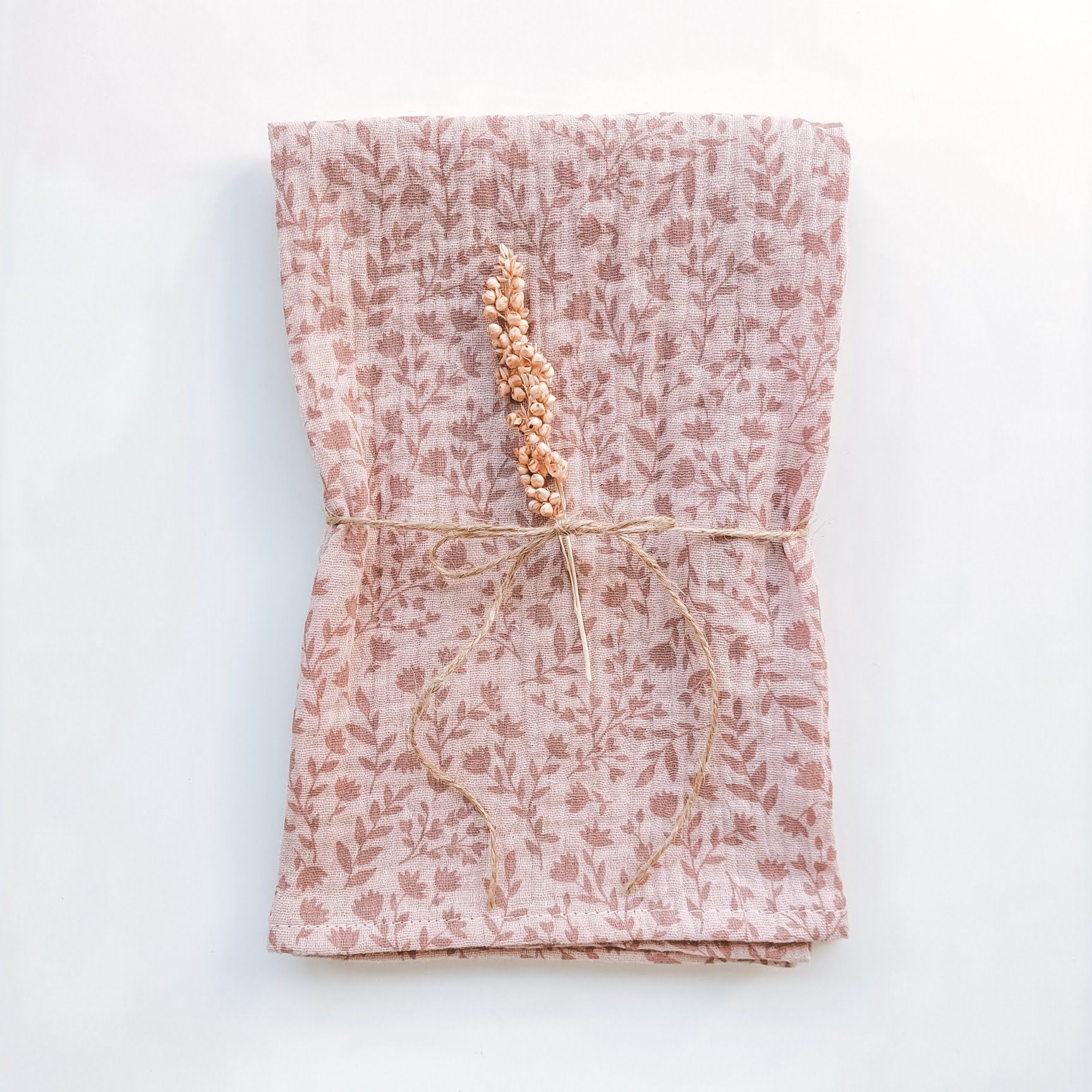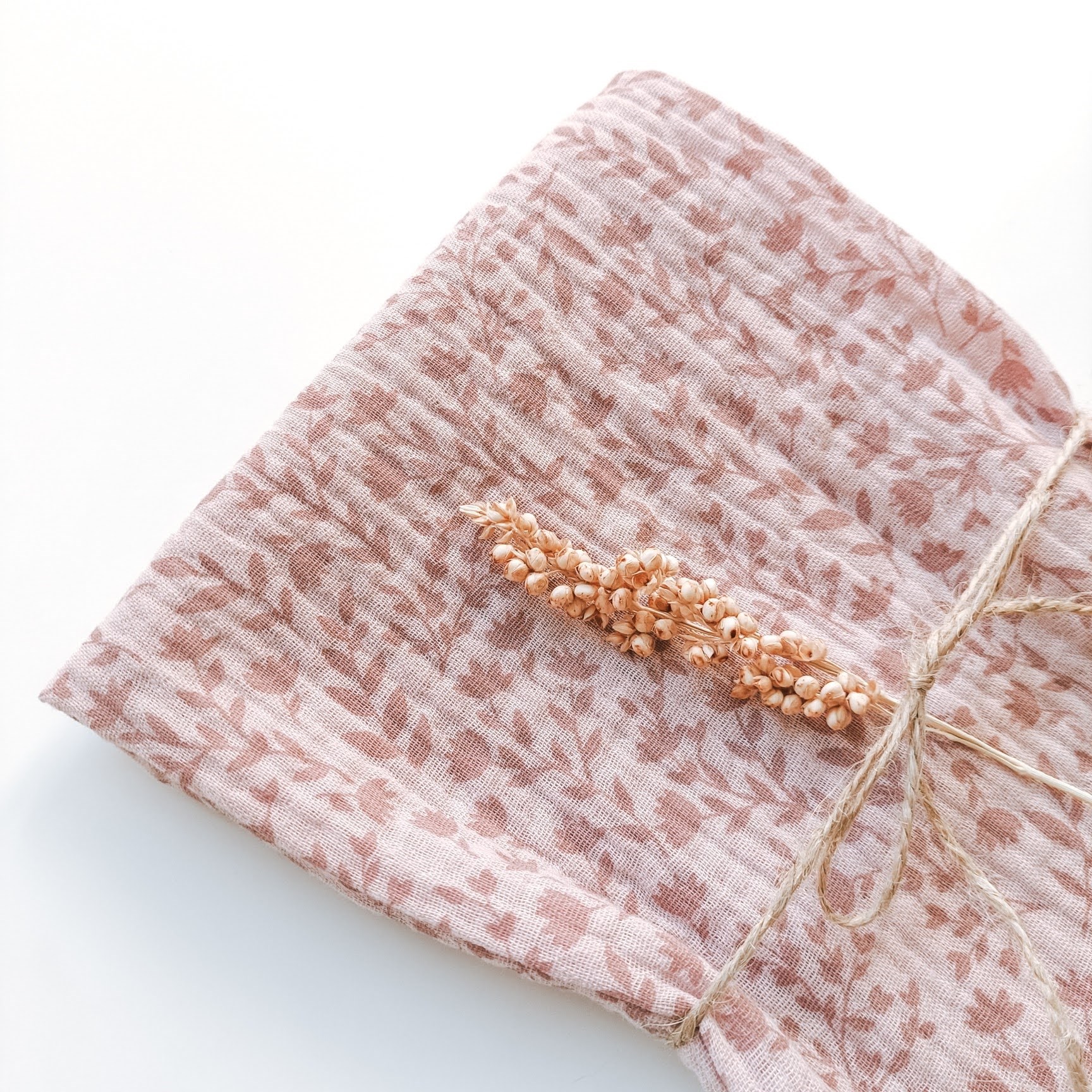 Pieluszka muślinowa wykonana z bardzo delikatnej bawełny typu "double gaze" w kolorze wrzosowego różu w kwiatuszki oraz gałązki.