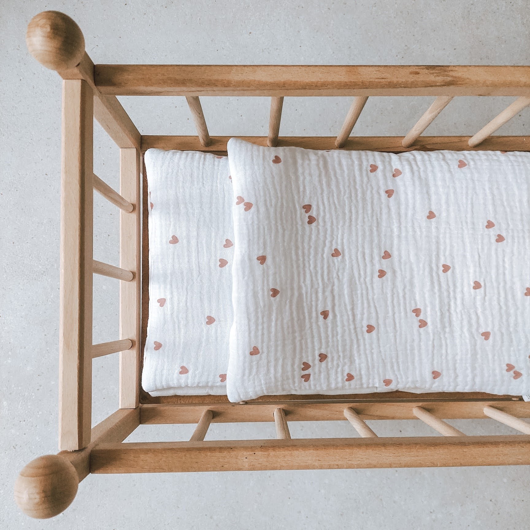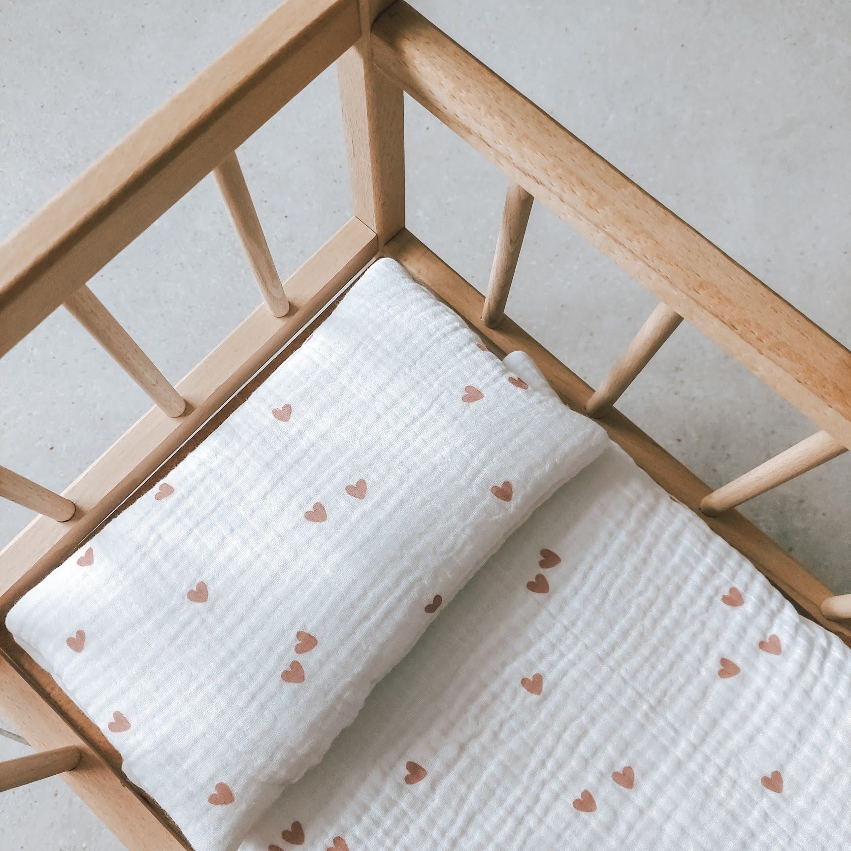 W skład zestawu wchodzi mini kołderka i poduszka, starannie uszyte z dbałością o każdy detal. Subtelne kolory i minimalistyczny design doskonale pasują do wózków oraz łóżeczek dla lalek.