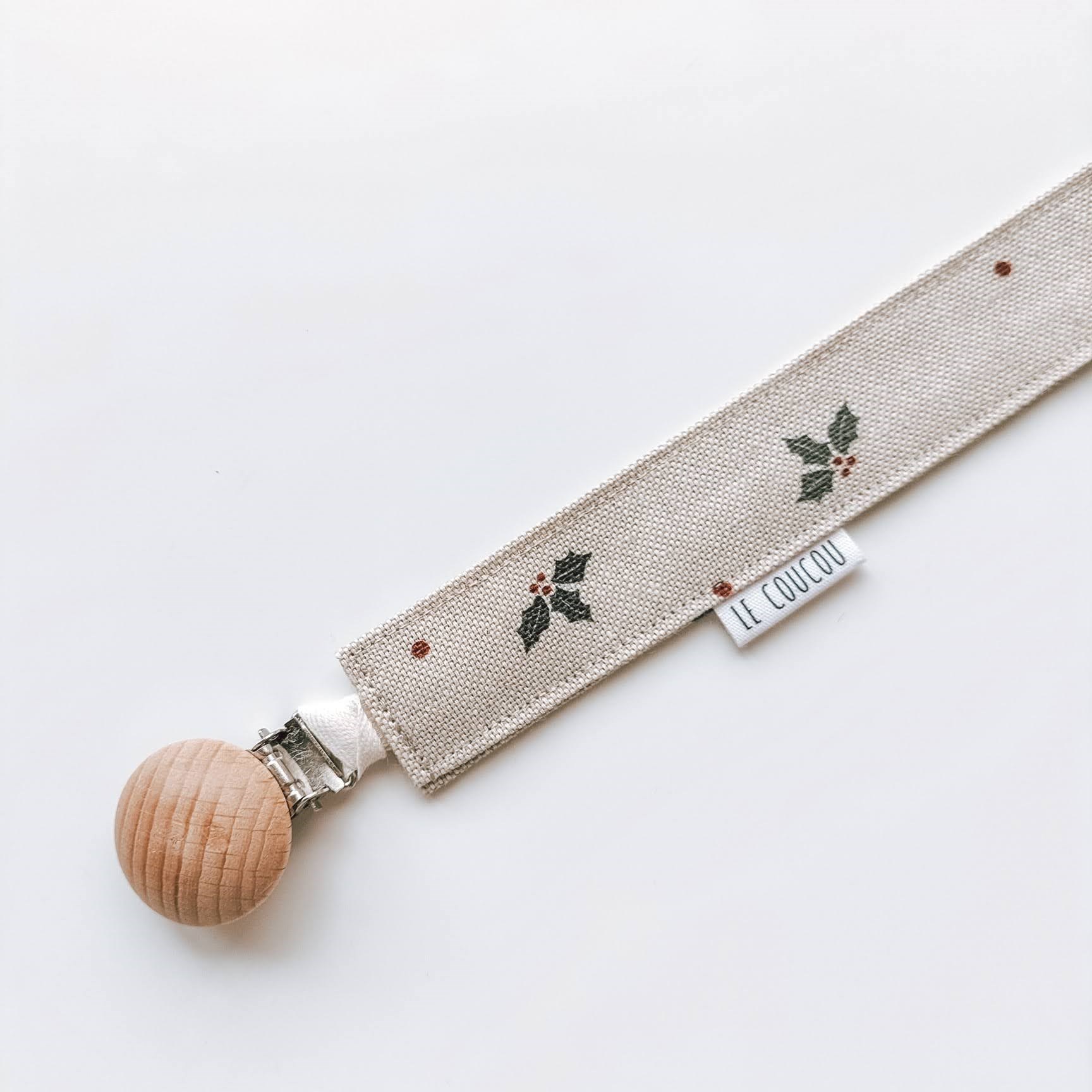 Zawieszka do smoczka lub gryzaka wykonana z bawełny w kolorze naturalnego lnu we wzór ostrokrzewu, z okrągłym drewnianym klipsem.