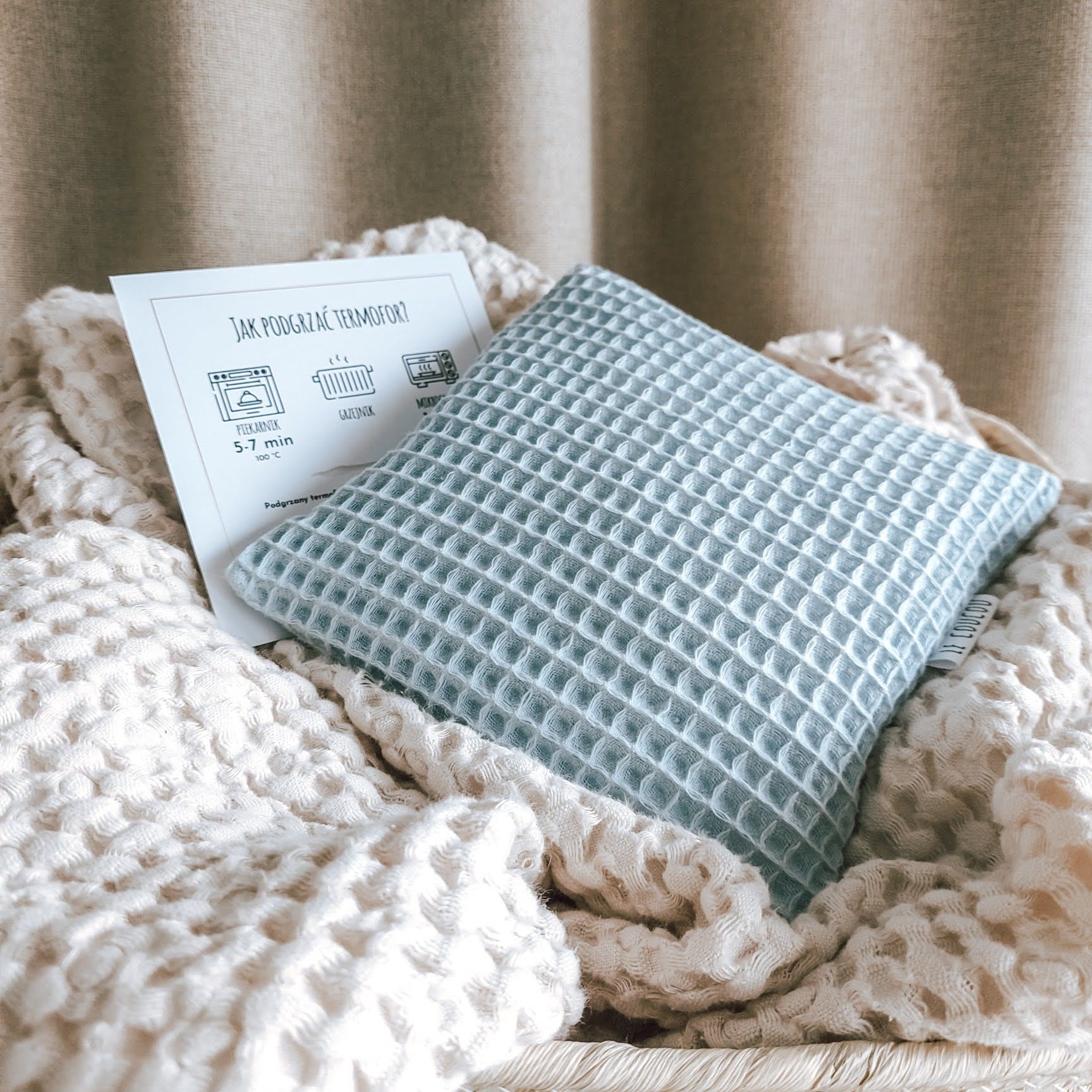 Ekologiczny termofor z pestkami wiśni to niezawodny sposób na kolki i bolący brzuszek malucha. Wystarczy wyjąć woreczek z pestkami z waflowego pokrowca, podgrzać go w kuchence mikrofalowej lub piekarniku, albo po prostu położyć na gorącym grzejniku. Naturalny, orzechowy zapach rozluźnia i relaksuje. Termoforek można również stosować po schłodzeniu w lodówce lub zamrażarce w leczeniu takich dolegliwości jak gorączka, siniaki i stłuczenia.