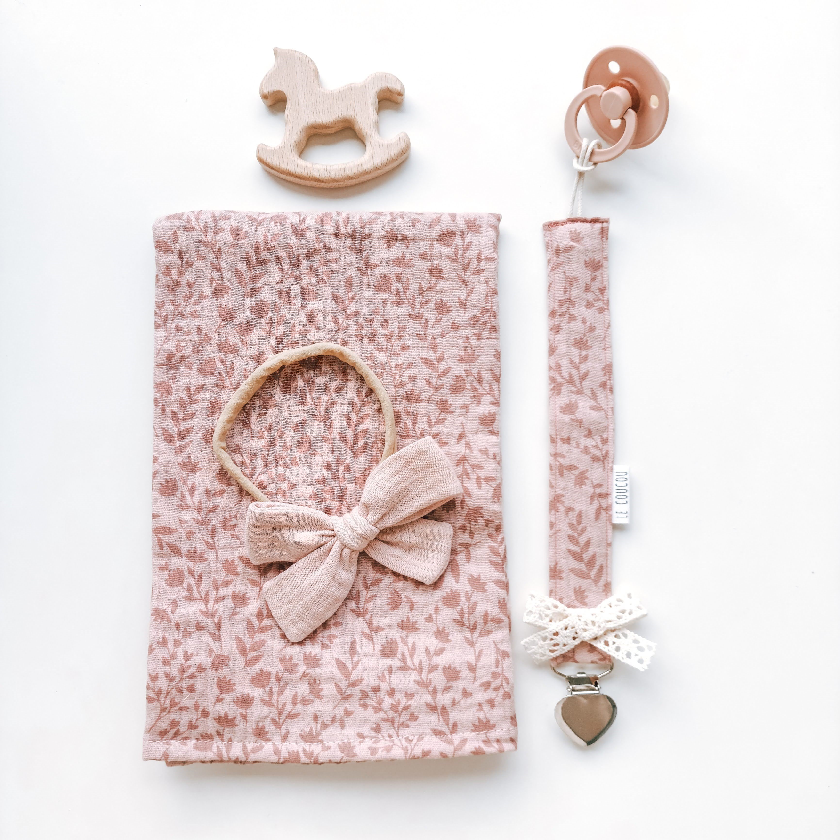 Zawieszka do smoczka lub gryzaka wykonana z bawełny muślinowej w kolorze wrzosowego różu w gałązki i kwiatuszki z klipsem w kształcie srebrnego serduszka. W wersji z koronkową kokardką w kolorze ecru lub bez kokardki.