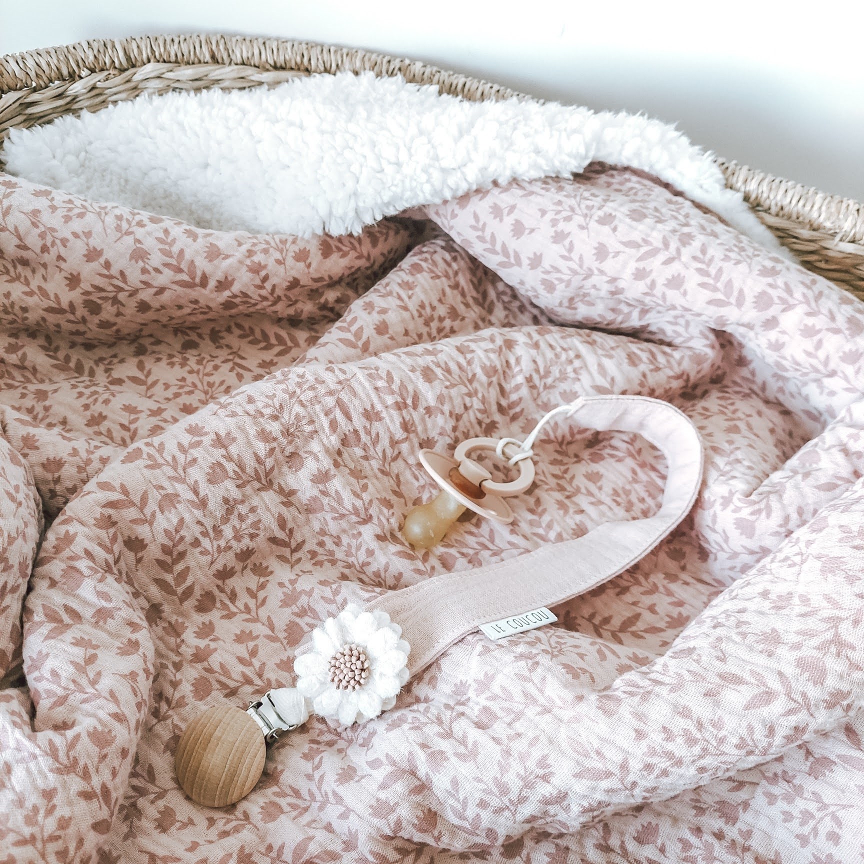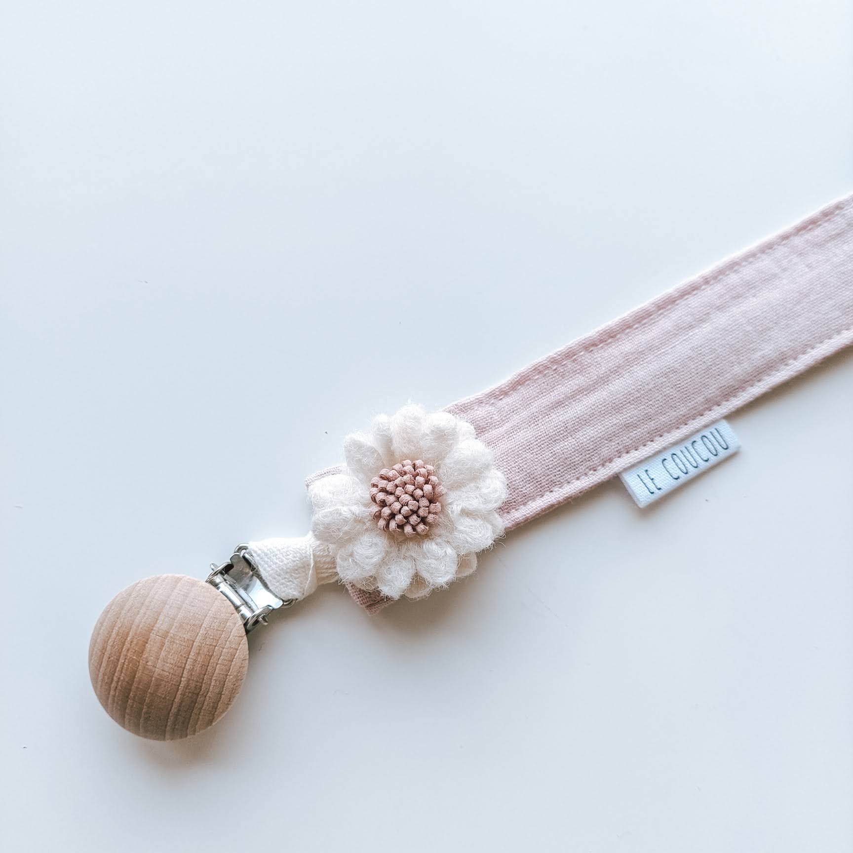 Zawieszka do smoczka lub gryzaka wykonana z bawełny muślinowej w kolorze różu z kwiatuszkiem w kolorze śmietankowej bieli, z drewnianym klipsem.