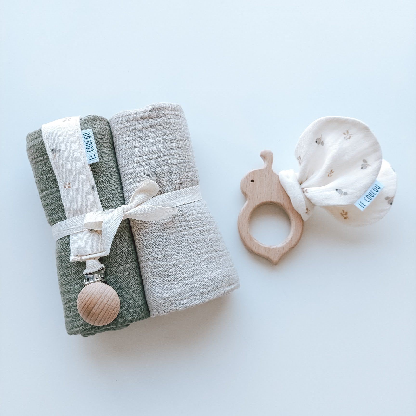 - dwóch muślinowych pieluszek w rozmiarze 50x60cm
