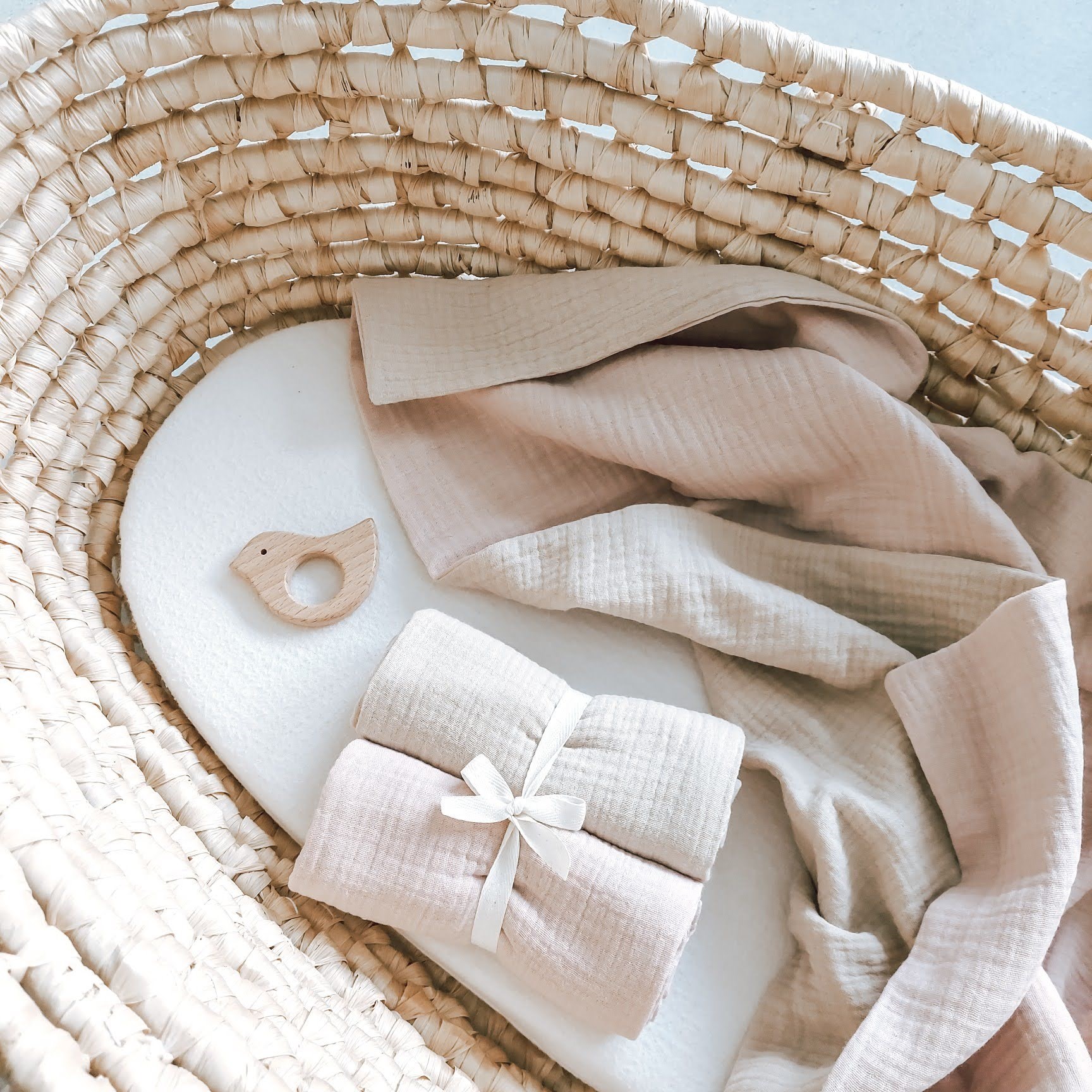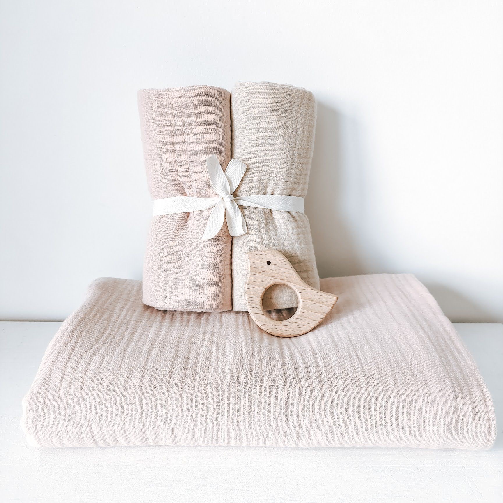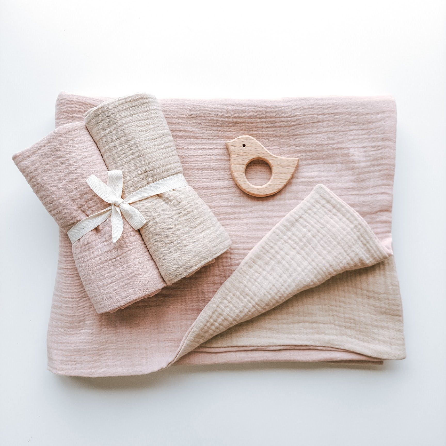 - 2 muślinowych pieluszek w kolorze różu i beżu w rozmiarze 50x60cm