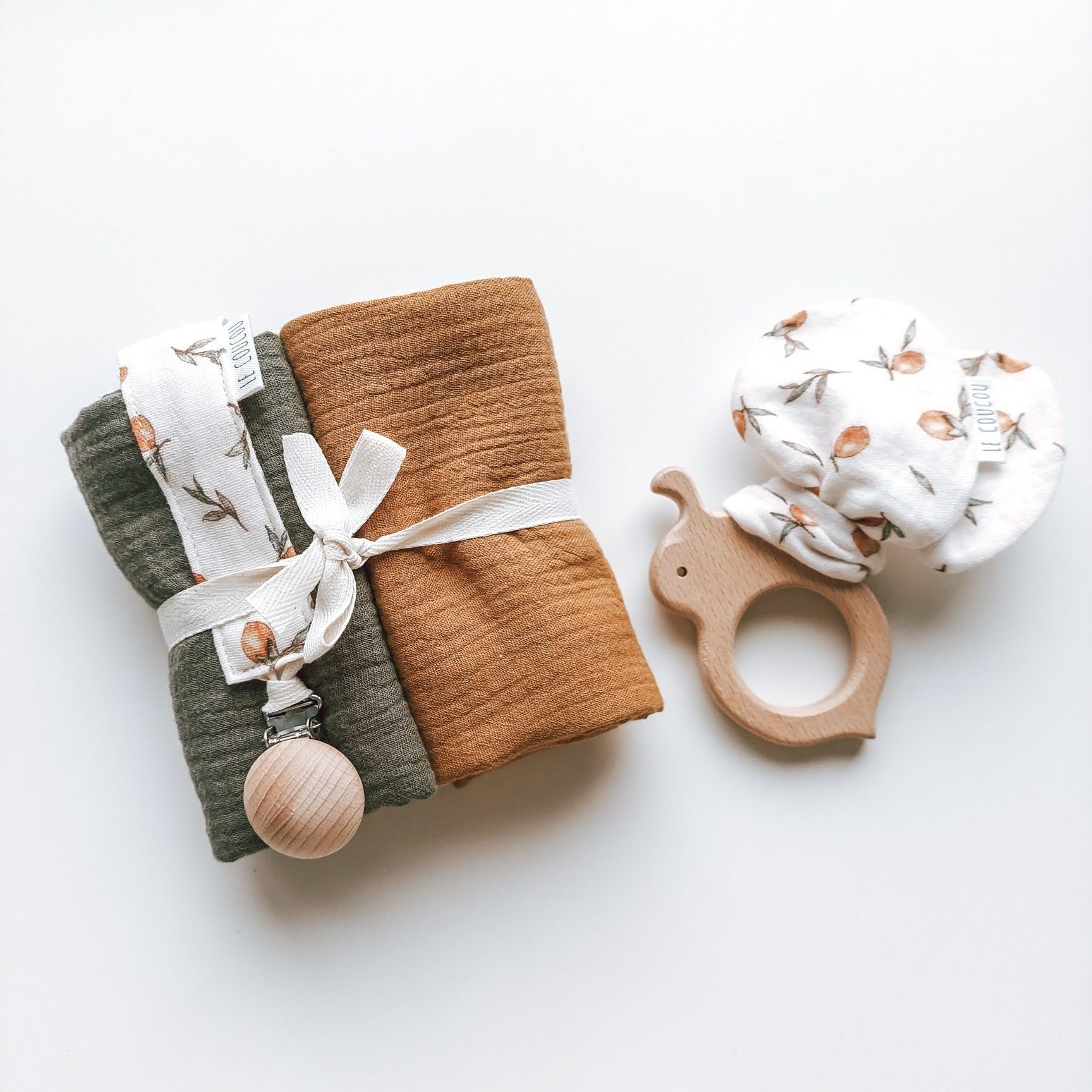 - dwóch muślinowych pieluszek w rozmiarze 40x50cm
