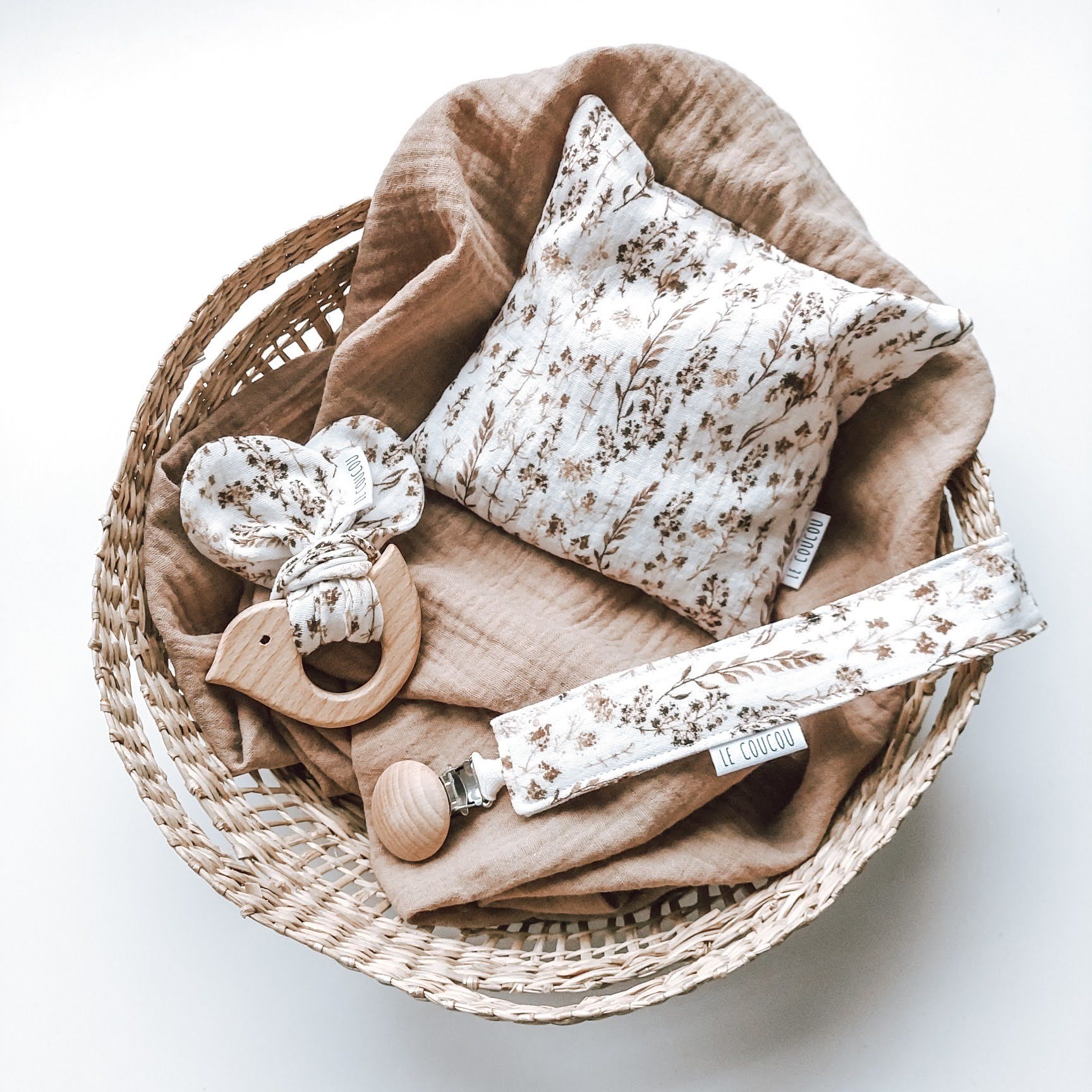 - muślinowa zawieszka do smoczka – praktyczny dodatek, który utrzymuje smoczek lub gryzak zawsze w zasięgu ręki